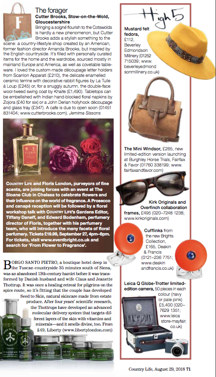 In August 2018 Seed to Skin was featured in Country Life, in a Luxury News feature. The article reads as follows: “Borgo Santo Pietro, a boutique hotel deep in the Tuscan countryside 35 minutes south of Siena, was an abandoned 13th-century hamlet before it was transformed by Danish husband and wife Claus and Jeanette Thottrup. It was once a healing retreat for pilgrims on the spice route, so it’s fitting that the couple has developed Seed to Skin, natural skincare made from estate produce. After four years’ scientific research, the Thottrups have developed an advanced molecular delivery system that targets different layers of the skin with vitamins and minerals – and it smells divine too.“