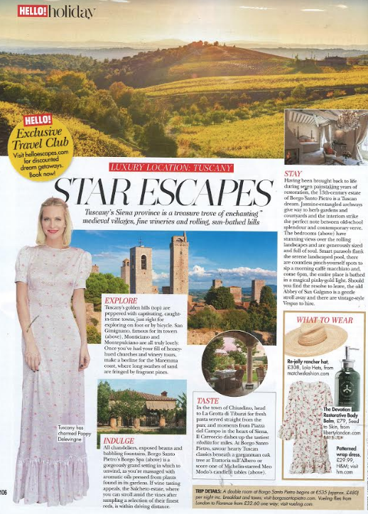 In August 2018, The Devotion has been included in Hello!, in the ‘What to wear’ section of ‘Star Escapes’ page. The article also featured a review of Borgo Santo Pietro, our 5 star hotel in the Tuscan countryside.